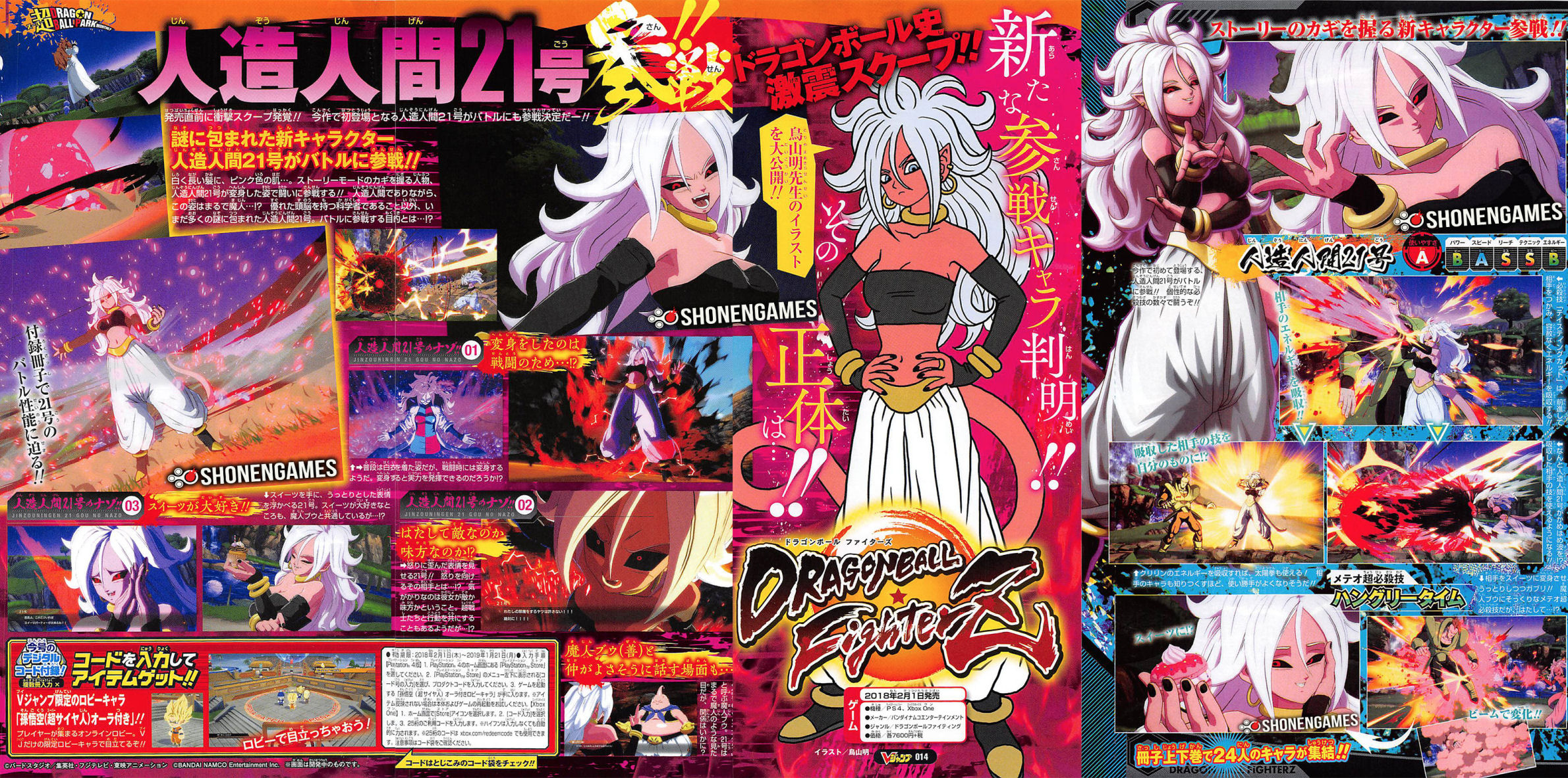 Alors que tout le monde se demandait si C-21, le nouveau personnage conçu par Akira TORIYAMA spécialement pour ce jeu, allait faire partie des personnages jouables ou simplement être une personnage du mode histoire, le tout dernier exemplaire du mensuel V-Jump vient de répondre à la question que les fans du jeu pouvaient se poser. Et en plus de devenir une personnage jouable, elle obtient son propre power-up ou plutôt une transformation qui change complètement son personnage, elle devient une Majin.