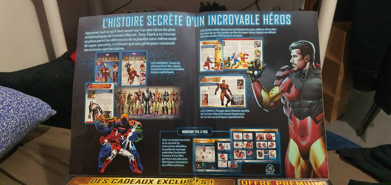 Vous obtenez aussi un autre fascicule dédié à la présentation de la collection. Sur chacune des facettes, vous pouvez voir chacun des cadeaux offerts réservés aux abonnés, nous en parlerons un peu plus bas dans l'article. Mais une fois totalement déplié, ce second fascicule fait office d'affiche géante avec la superbe pose d'Iron Man et il s'agit du modèle articulé.