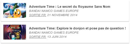 D3Publisher (D3P) et Cartoon Network Enterprises (CNE) ont aussi développé des jeux Adventure Time, qui ont été distribué par BANDAI NAMCO Games Europe, afin de permettre aux fans de la série de participer aux aventures de Jake & Finn tout en s'amusant à partir de leurs consoles de jeux.