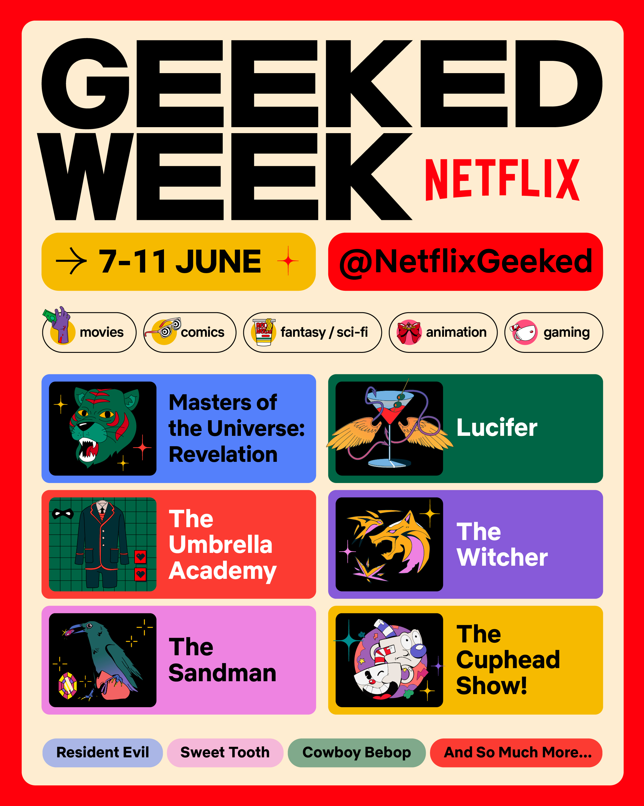 Le rendez-vous est donné par le compte Netflix Geeked qui tease une liste d'annonces du 7 au 11 juin 2021 autour de plusieurs séries et films très attendus avec les thèmes suivants : films, comics, fantastique/science-fiction, animation et gaming.