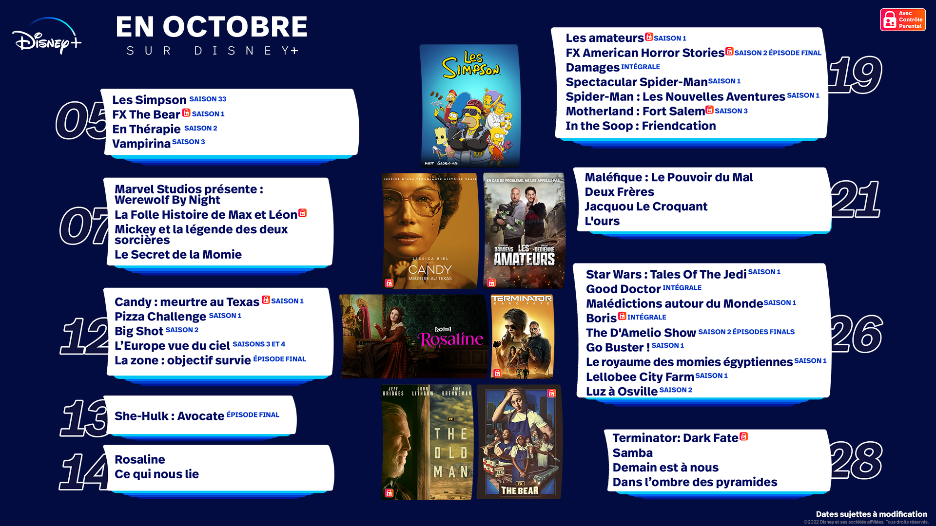 Disney+ France a mis en ligne son planning du mois d'octobre et il n'y a aucune mention de Bleach… il est donc maintenant pratiquement certain que l'arc final de l'anime n'aura pas droit à du simulcast chez nous. Au mieux, la série devrait apparaître le 10 ou le 11 octobre mais aucun de ces deux chiffres n'apparaît dans ce visuel !