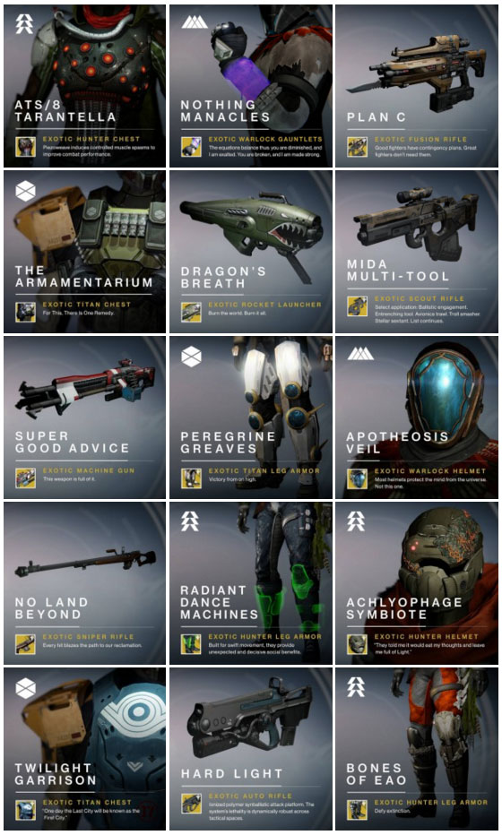 Puis comme promis par Bungie, cette nouvelle mise à jour apporte aussi de 15 nouveaux exotiques dont 2 exclusifs et 13 de l'An 1 qui passe en An 2, ainsi que le rééquilibrage de certains items. Quant au Brise-Soleil, la doctrine du Titan, cette dernière sera diminuée :