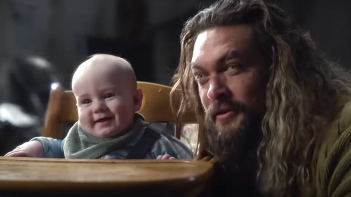 « Arthur Curry Jr. alias Aquababy qui parle aux poissons devant son père Arthur Curry (Jason Momoa) »