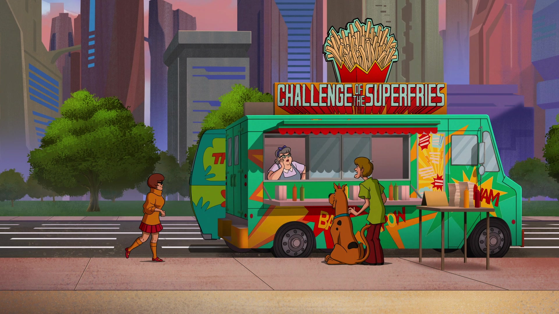 Véra, Scooby-Doo et Sammy devant la camionnette du défi des super-frites