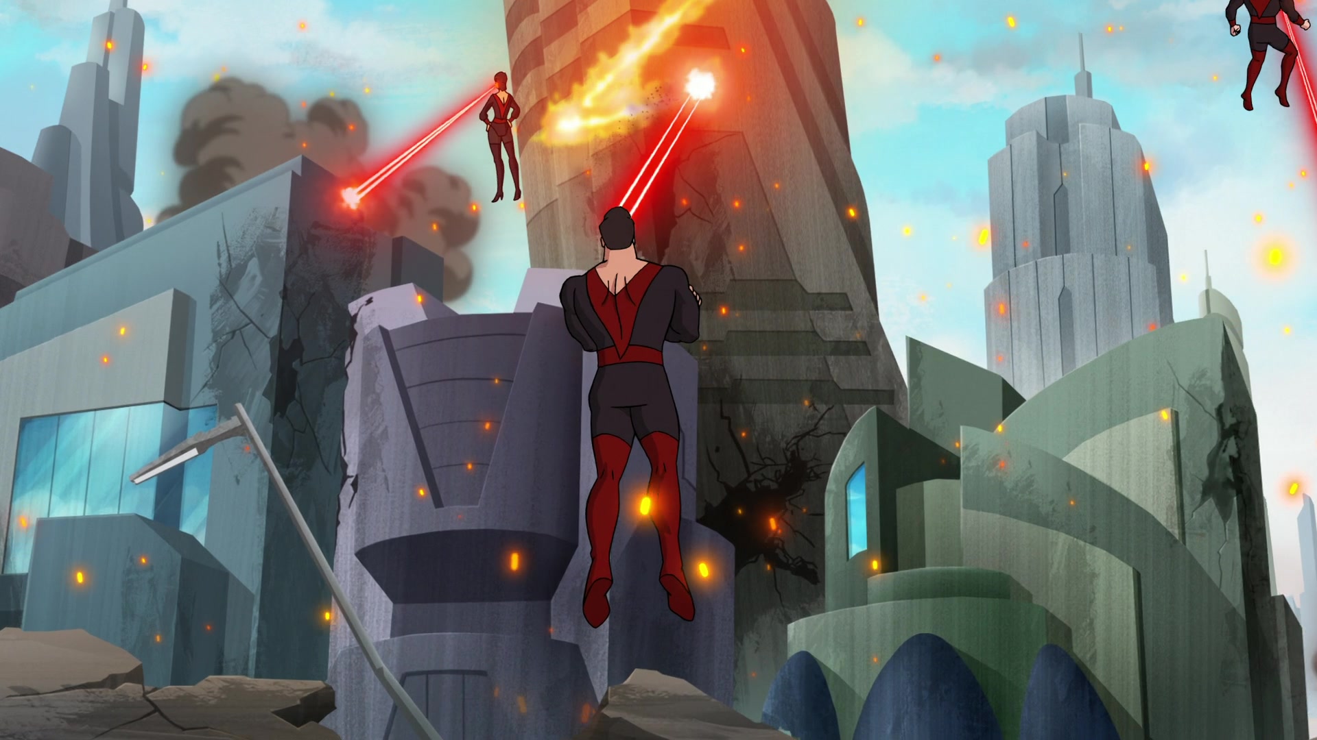 Général Zod, Non et Ursa utilisent leurs pouvoirs pour tout détruire