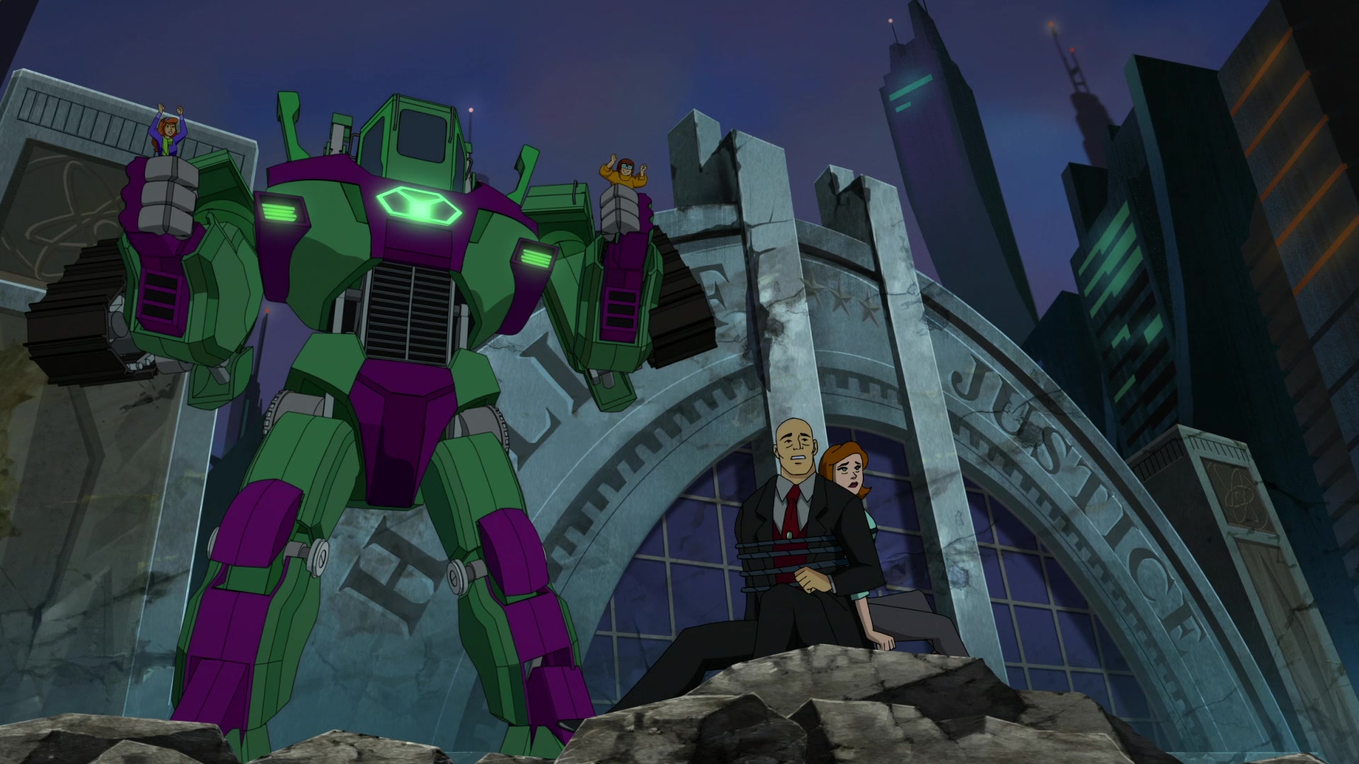 Daphné et Véra dans les bras du robot géant de Lex Luthor, qui est ligoté au sol avec Mercy Graves