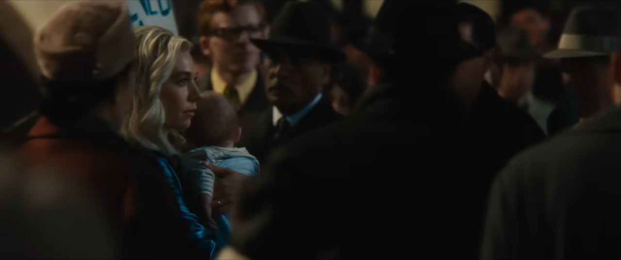 « La Femme Invisible/Susan Storm (Vanessa Kirby) tient son bébé dans la foule »