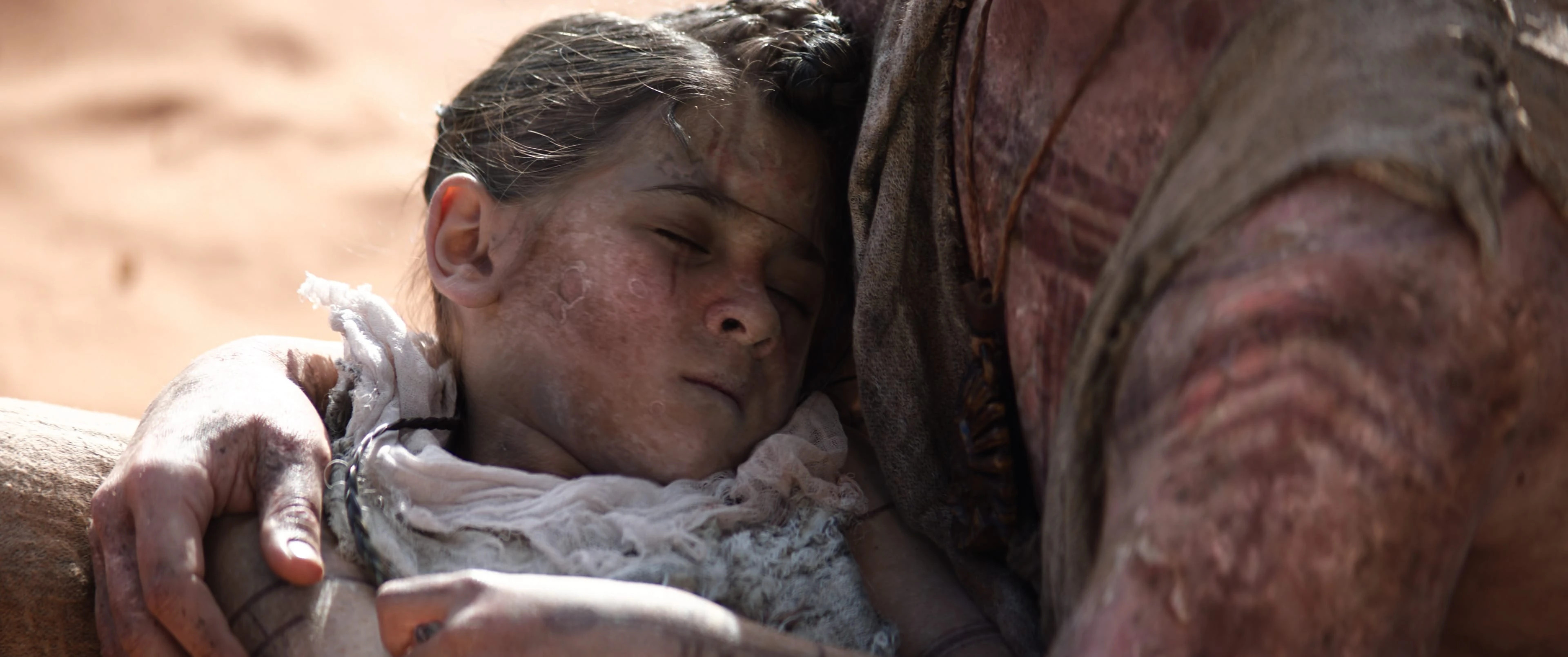 « Gorr (Christian Bale) voit sa fille Love (India Rose Hemsworth) mourir dans ses bras de famine »