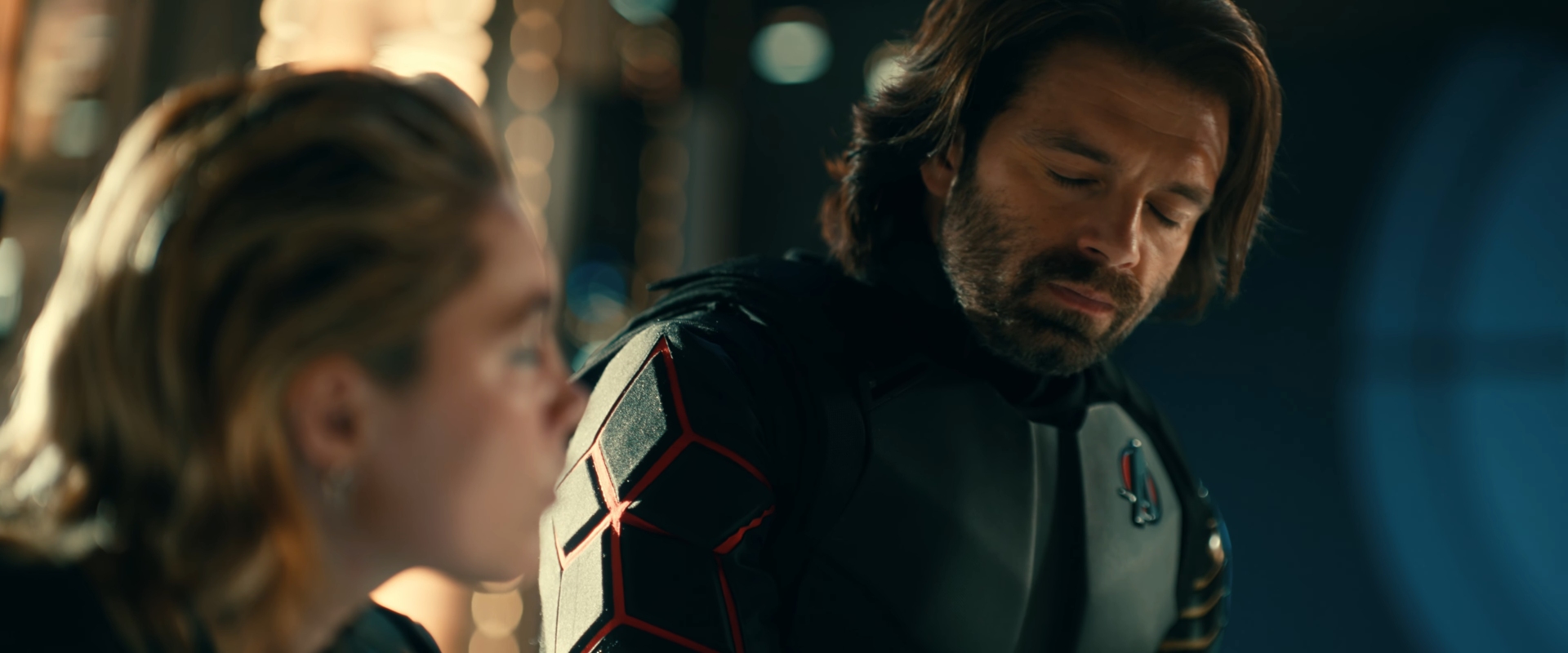 « Scène post-générique : Bucky (Sebastian Stan) conseille à Yelena (Florence Pugh) de lancer l'image satellite alors qu'un objet identifié entre en orbite »